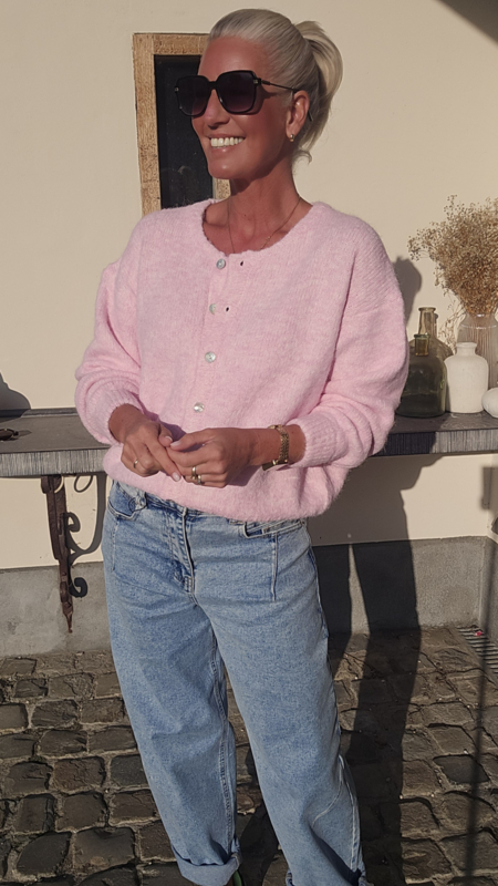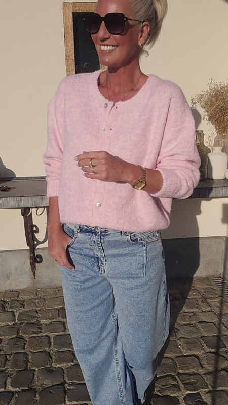 Lekker zachte cardigan, knoopjes tot onderaan, ronde hals, lange mouwen. Kan perfect tot XL.