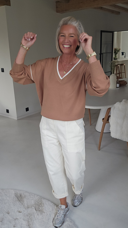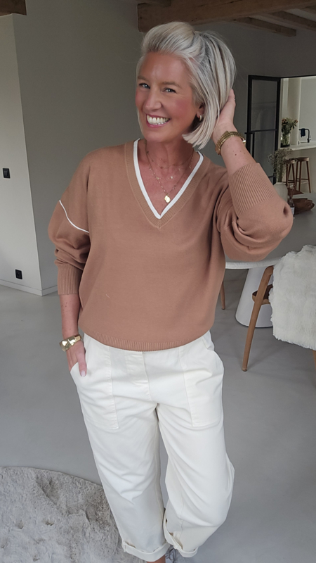 De Amelie Knit is zo’n trui die je er altijd bij neemt. Zacht, licht en super comfortabel, met een flatterende V-hals en subtiele contrasterende details aan de hals en mouwen die ’m nét dat tikkeltje extra geven.