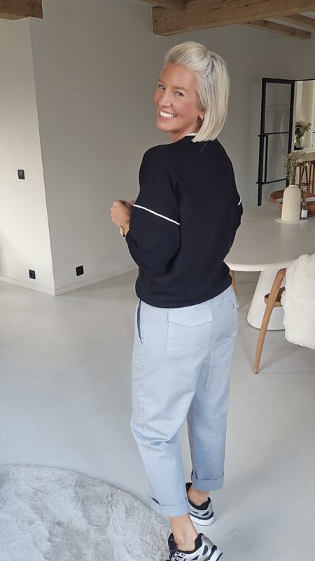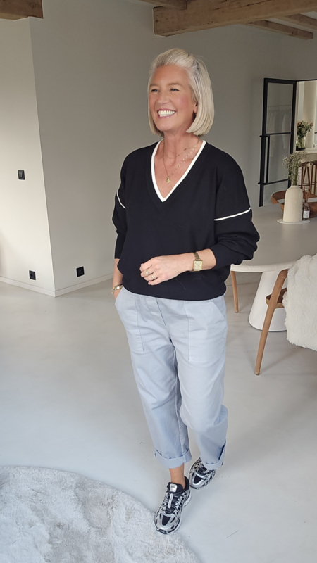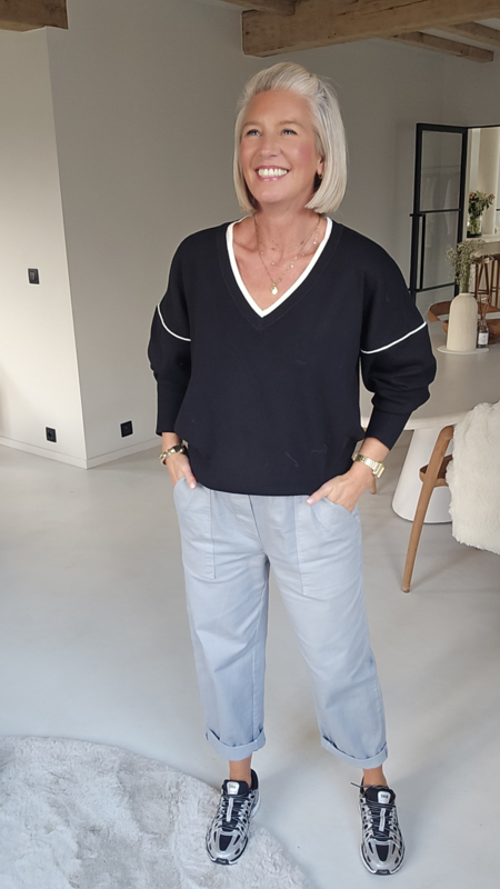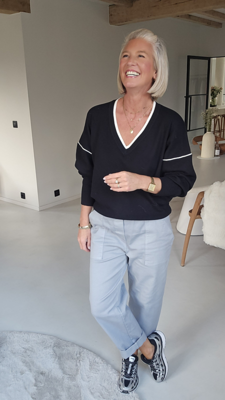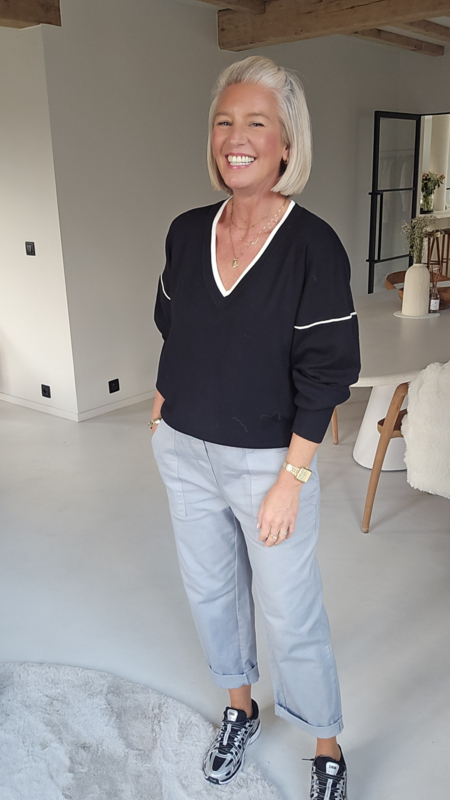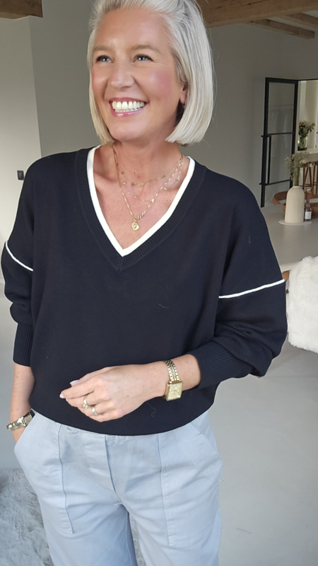 De Amelie Knit is zo’n trui die je er altijd bij neemt. Zacht, licht en super comfortabel, met een flatterende V-hals en subtiele contrasterende details aan de hals en mouwen die ’m nét dat tikkeltje extra geven.