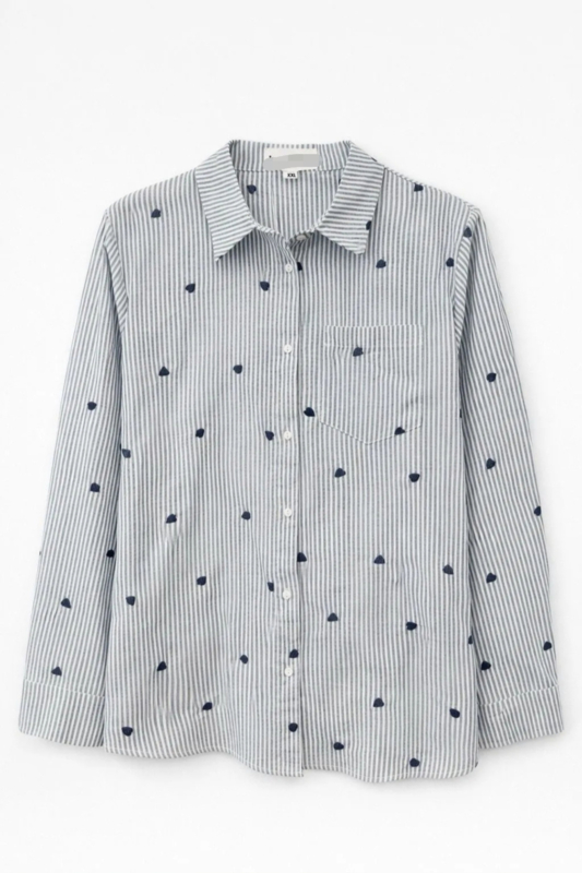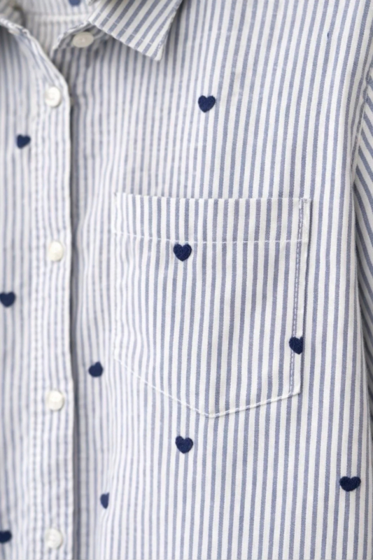 Een blouse die instant vrolijkheid brengt 🤍 De fijne streepjes gecombineerd met subtiele geborduurde hartjes geven deze blouse een speelse maar elegante uitstraling. De klassieke kraag en knoopsluiting maken dit item perfect voor zowel casual als meer geklede looks.