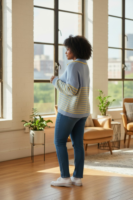 Een knit die meteen zonnestralen in je outfit brengt ☀️ De frisse combinatie van soft blue met subtiele gele strepen geeft deze trui een speelse, Italiaanse summer vibe. De open kraag en relaxte pasvorm zorgen voor een effortless en comfortabele look.
