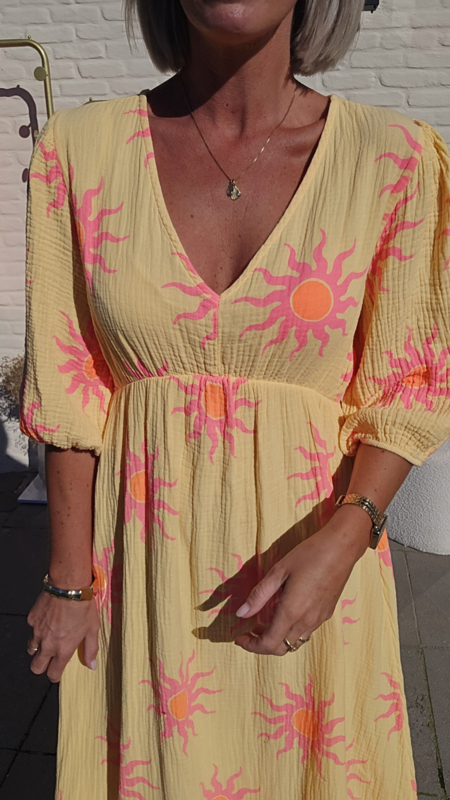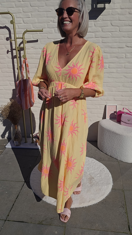 De flatterende empire taille, V-hals en speelse mouw zorgen voor een vrouwelijke look zonder moeite. Draag haar met slippers, sneakers of sandalen en je outfit is klaar.