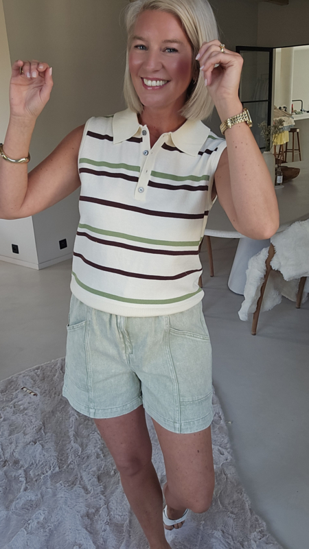 De NELLA sleeveless polo knit is een stijlvolle knit met een sportieve, retro touch. De fijne strepen in zachte contrastkleuren en de polokraag zorgen voor een effortless chic uitstraling — perfect om solo te dragen of te layeren.