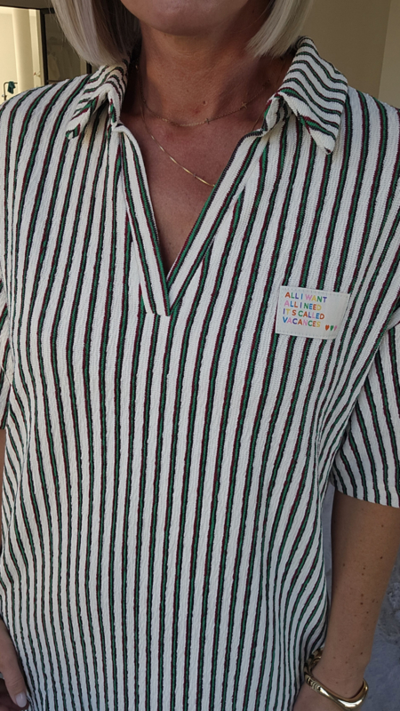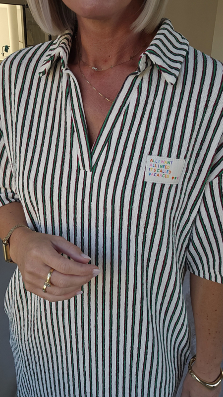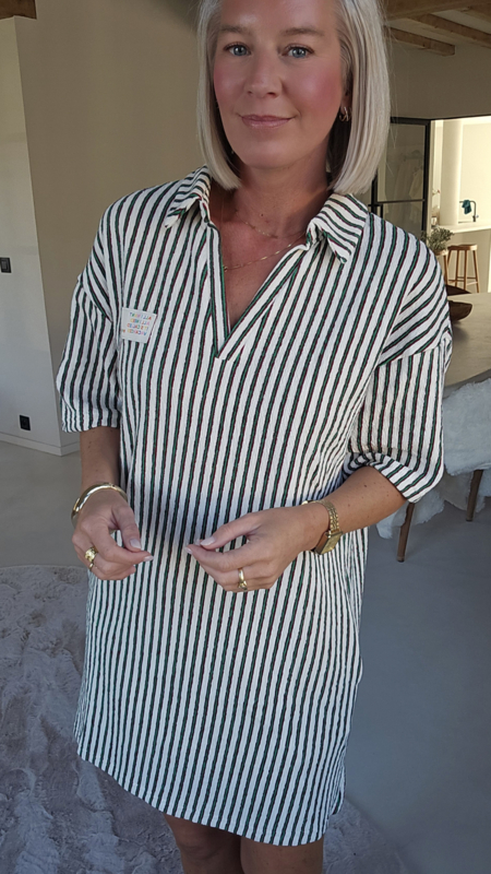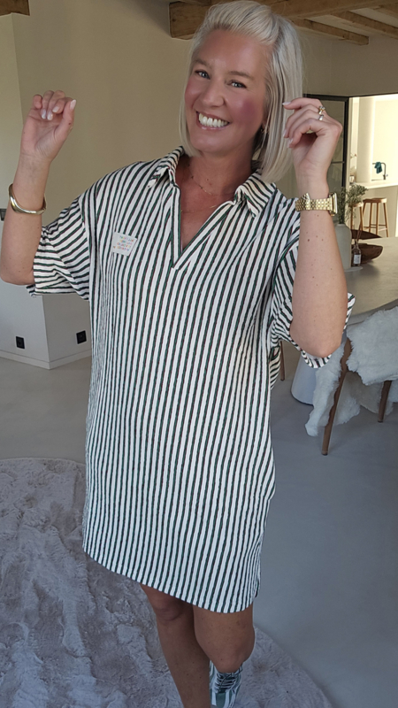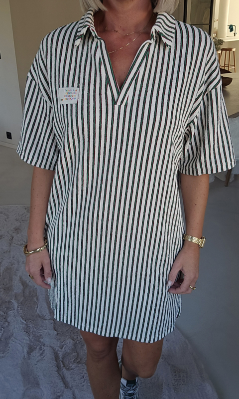 Comfortabele en speelse jurk in zachte sponsstof met verticale strepen. De losse, rechte fit en korte mouwen zorgen voor een relaxte uitstraling, terwijl de kraag en V-hals het geheel een casual chic touch geven. Ideaal voor warme dagen, vakantie of gewoon een effortless everyday look.