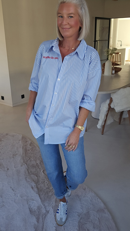 Een soepelvallend, licht oversized gestreept hemd met het speelse “Out of the office” opschrift op de rug. Draagt supercomfortabel en geeft elke outfit meteen een fun twist.