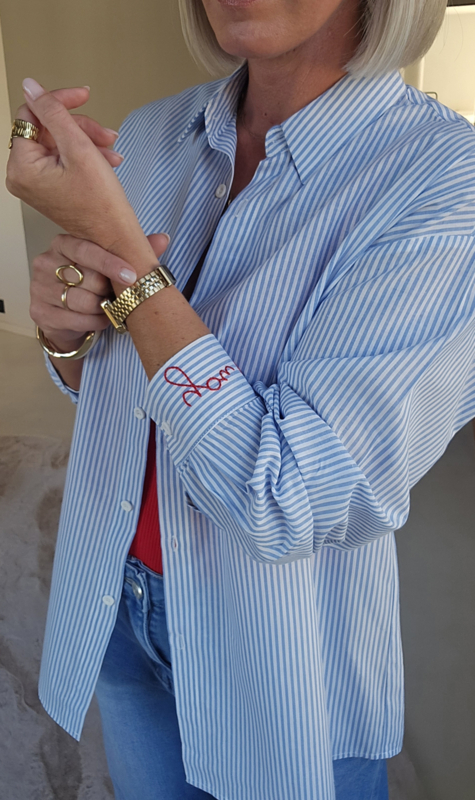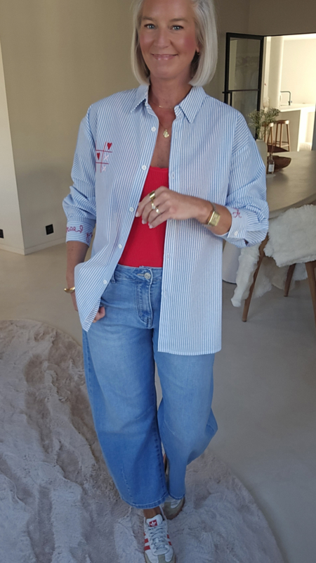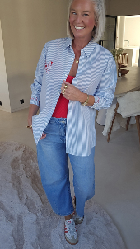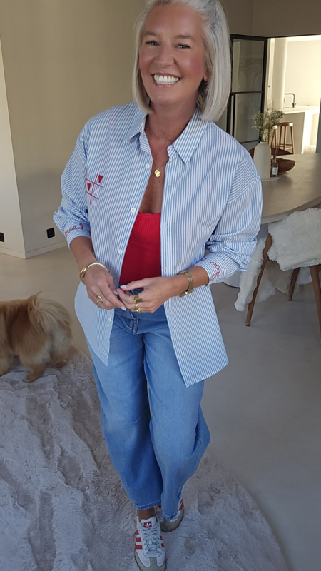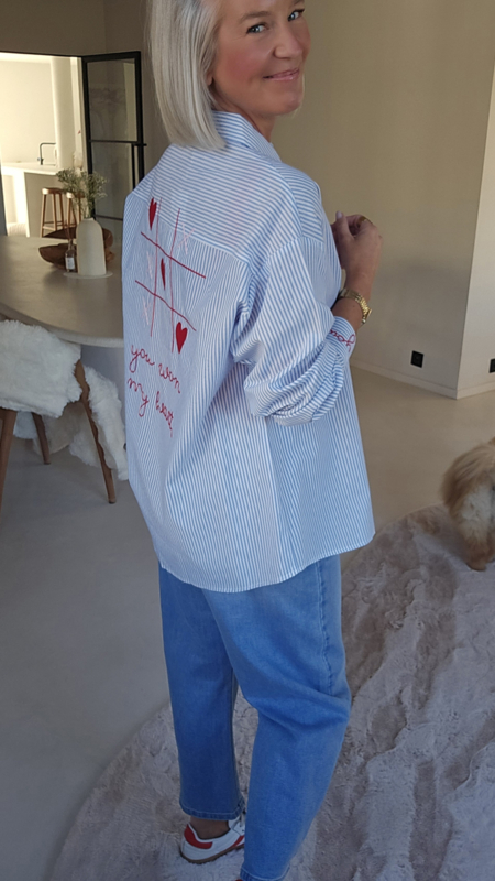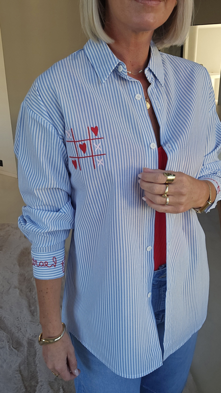 LOVE LETTER is zo’n hemd dat je outfit meteen karakter geeft. De blauw-witte streepjes zorgen voor een tijdloze basis, terwijl het rode borduursel met hartjes en “love” details achteraan en op de mouw haar nét dat extra geven.
