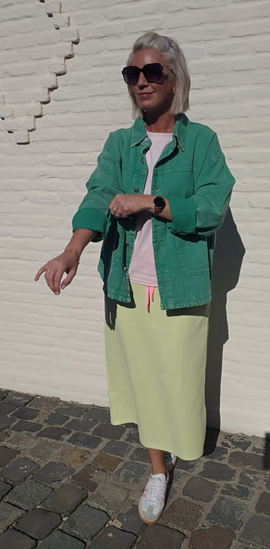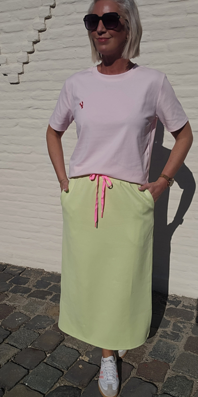 De ELIE midi skirt is een comfortabele en speelse rok die perfect past bij een casual maar stijlvolle outfit. Dankzij de rechte midi lengte en elastische tailleband zit deze rok heerlijk comfortabel en flatterend.