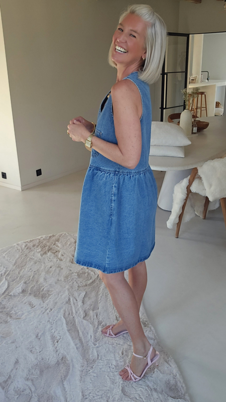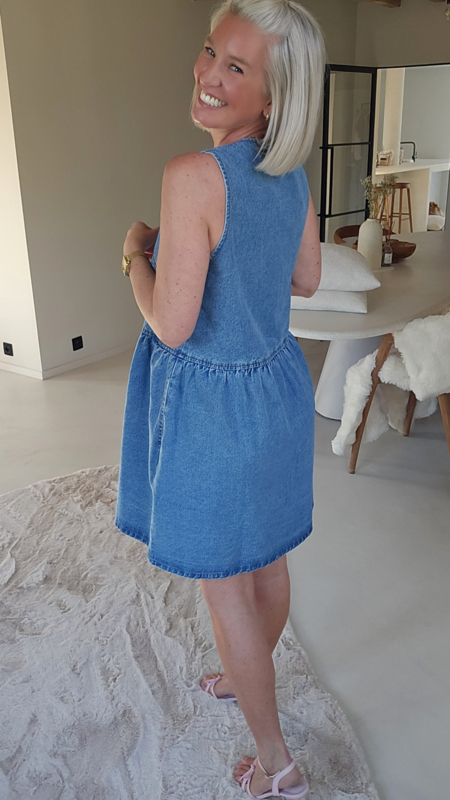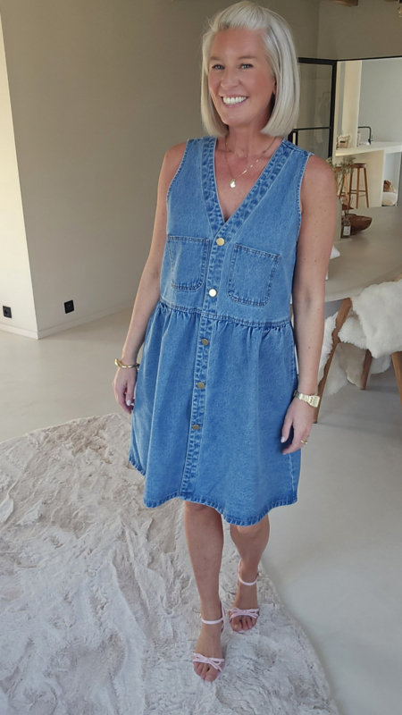 Een luchtige denim jurk met een flatterende V-hals en knoopsluiting vooraan, die zorgt voor een casual maar vrouwelijke look.