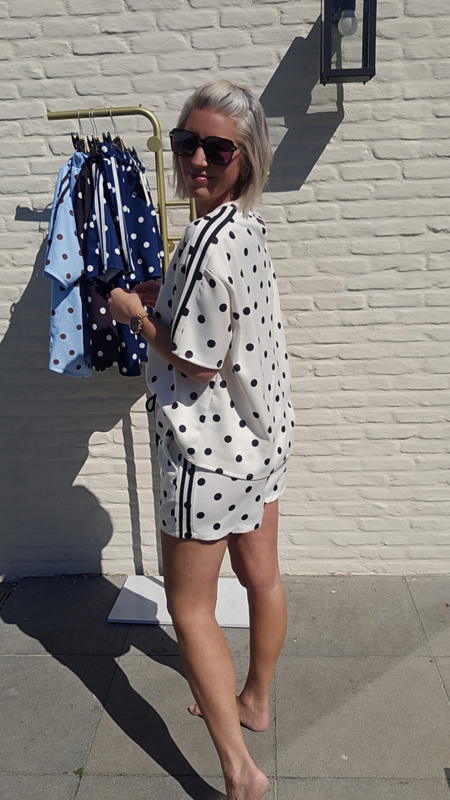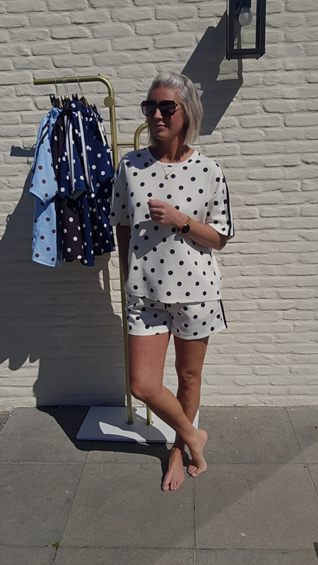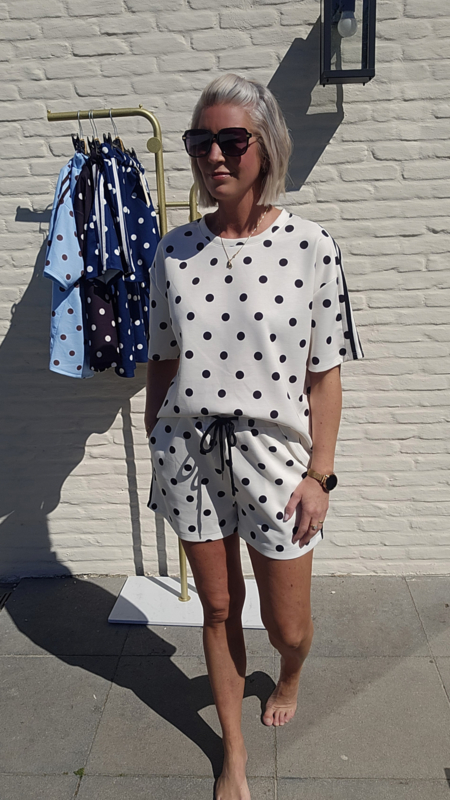Speelse tweedelige set met stippenprint en sportieve streepdetails.