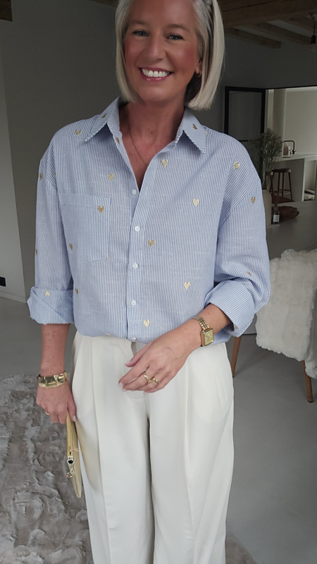 Dit Golden Hearts shirt combineert tijdloze blauw-witte strepen met subtiele gouden hartjes voor nƩt dat beetje extra.