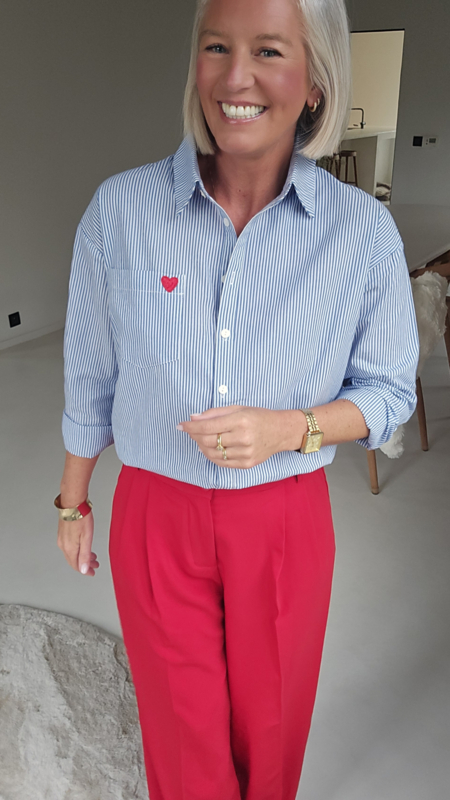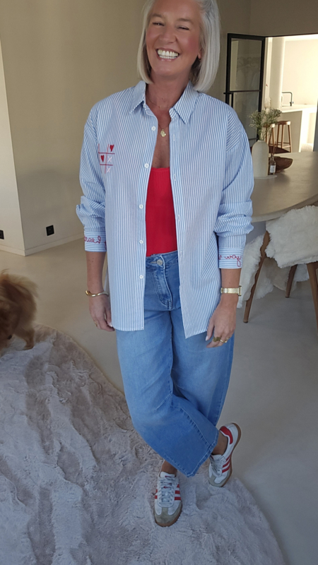 LOVE LETTER is zoān hemd dat je outfit meteen karakter geeft. De blauw-witte streepjes zorgen voor een tijdloze basis, terwijl het rode borduursel met hartjes en āloveā detailsā¦ā¬ 39,00last 3!