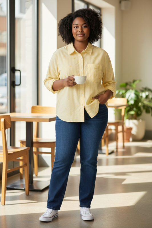 AMORE cotton shirt curve yellowEen blouse die instant vrolijkheid brengt š¤ De fijne streepjes gecombineerd met subtiele geborduurde hartjes geven deze blouse een speelse maar elegante uitstraling. De klassieke kraag en knoopsluiting maken dit item perfectā¦