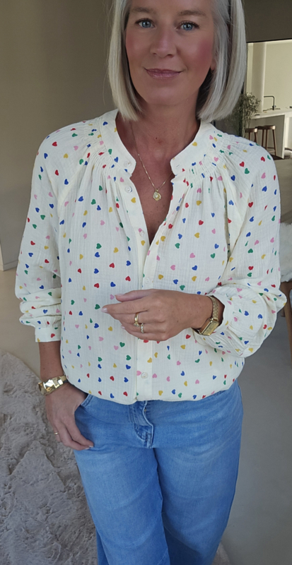 De Nina blouse is een vrolijke must-have die meteen kleur en speelsheid aan je outfit toevoegt. De lichte katoenen stof en subtiele hartjesprint zorgen voor een zachte, luchtige feel, terwijl de plooidetails aan de hals een…