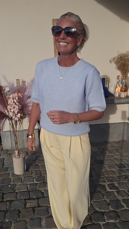 De perfecte geklede broek, mooie plooitjes vooraan, geen rits of knoop bij deze maar een elatische taille…