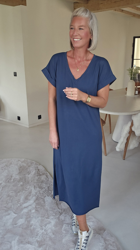 Heerlijke T-shirt jurk, v-hals en halflange mouwen met gestikte omslag.
